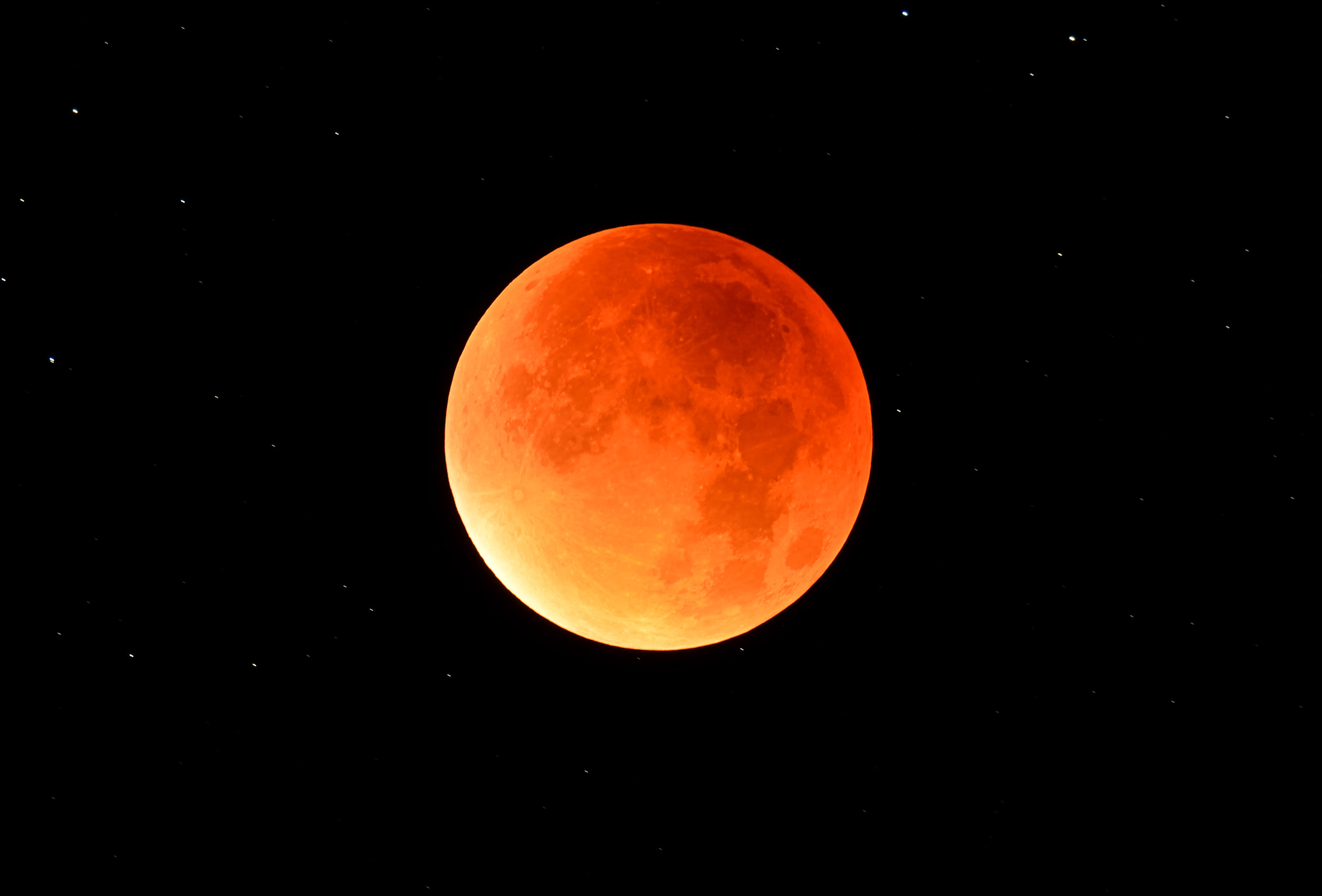 Totale Mondfinsternis und größter Vollmond des Jahres am 28.09.2015 um 4:47 Uhr. Man kann die Sterne im Hintergrund erkennen. INED 420/70, HEQ-5 Pro, TSFlat2, Fokalprojektion, Nikon D5200, 30s, ISO200 |